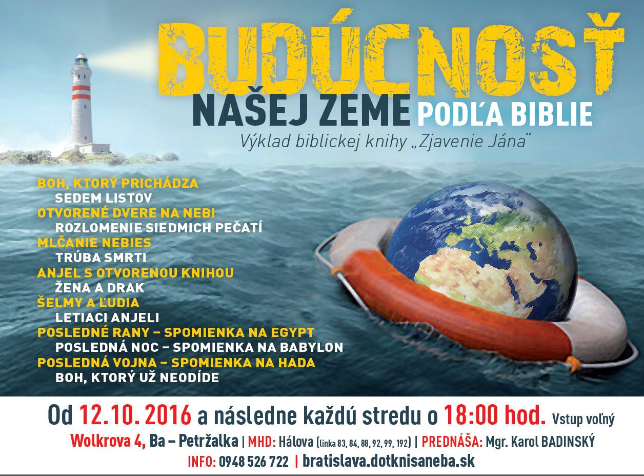 K čítaniu najčítanejšej knihy sveta – Biblie – sa hlási veľa Slovákov, avšak len málo z nich pozná obsah jej poslednej časti, ktorá nesie názov Zjavenie Jána alebo aj Apokalypsa. Mnohí kresťania ju považujú za tajomnú a ťažko pochopiteľnú, pretože je plná symbolov. Biblia sama však ponúka kľúč k tomu, ako túto záverečnú časť čítať a ako získať informácie, ktoré dokážu aj modernému človeku 21. storočia priniesť nový pohľad na vlastnú budúcnosť. Prednáškovo-študijný cyklus „Budúcnosť našej Zeme podľa Biblie“ otvorený pre širokú verejnosť, môže záujemcom pomôcť lepšie sa zoznámiť s obsahom biblickej knihy Zjavenie Jána.